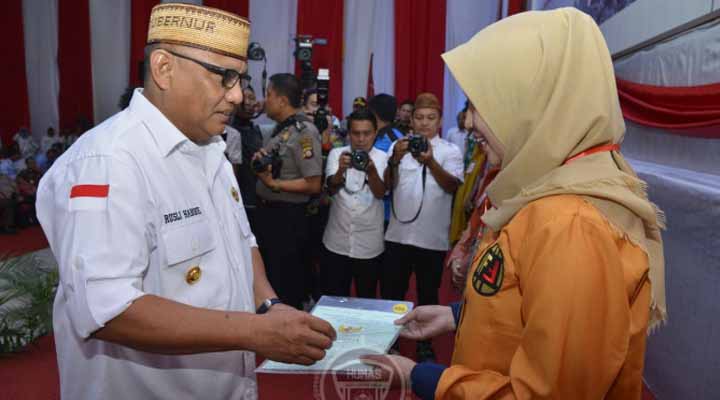 60DTK – GORONTALO – 1000 keluarga tidak mampu yang ada di Gorontalo menerima sertifikat program Pendaftaran Tanah Sistematis Lengkap (PTSL). Sertifikat tanah itu diserahkan Gubernur Gorontalo Rusli Habibie kepada warga yang terdiri dari 350 warga Kota Gorontalo dan 650 warga Kabupaten Bone Bolango, di Aula Rumah Dinas Walikota Bandhayo Yiladia, Kota Gorontalo, Rabu (11/12/2019).