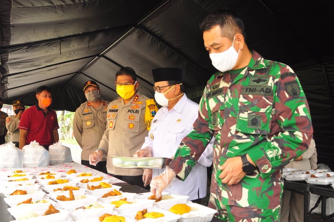 60DTK, Kabupaten Blitar – Dandim 0808/Blitar, Kris Bianto, meninjau langsung proses memasak dan pengemasan makanan di dapur umum TNI/Polri, bersama Bupati Blitar, Rijanto, Rabu (29/04/2020). Dapur umum yang didirikan untuk membantu masyarakat yang terdampak Covid-19 ini terletak di Mapolres Blitar, Kecamatan Talun.
