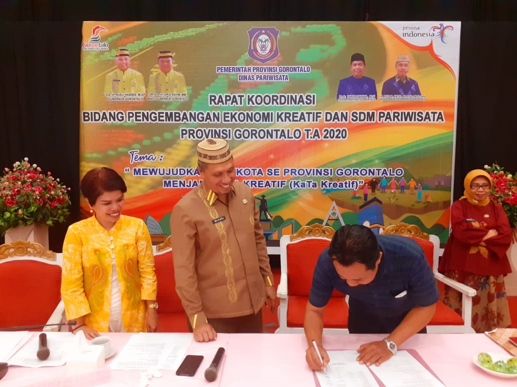60DTK-Gorontalo: Dalam rangka mengembangkan Ekonomi Kreatif (Ekraf) dan Sumber Daya Manusia (SDM) pariwisata Gorontalo di tahun 2020, Dinas Pariwisata Provinsi Gorontalo menggelar rapat koordinasi bersama jajaran pemerintah kabupaten/kota se – Provinsi Gorontalo, akademisi, dan sejumlah komunitas, di Grand Palace Convention Center, Kamis (12/03/2020).