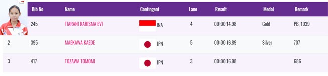Ia menjadi yang tercepat dengan waktu 14,98 detik. Karisma berhasil mengalahkan dua atlet Jepang yang berada di posisi dua dan tiga saat perlombaan berlangsung di Gelora Bung Karno, Senayan Jakarta pagi tadi.