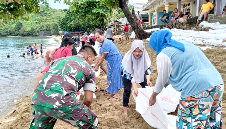 60DTK, Gorontalo Utara – Jajaran Koramil 1314-07 Atinggola telah melaksanakan kegiatan bakti TNI dengan membantu masyarakat yang ada di Desa Pasalae, Kecamatan Gentuma Raya dalam membuat tanggul pemecah ombak di pesisir pantai.