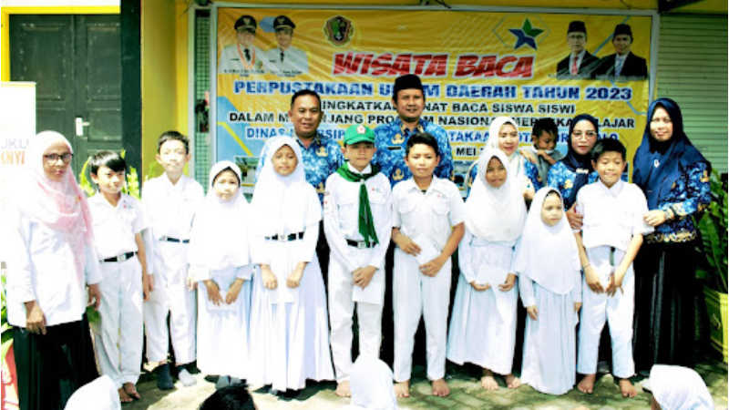 Plt. Kepala Dinas Kearsipan dan Perpustakaan, Haryono Soeronoto bersama para siswa-siswi SD N 22 Dungingi yang mengikuti kegiatan wisata belajar di Taman Kota Gorontalo, Rabu (17/05/2023). (Foto: Kominfo)