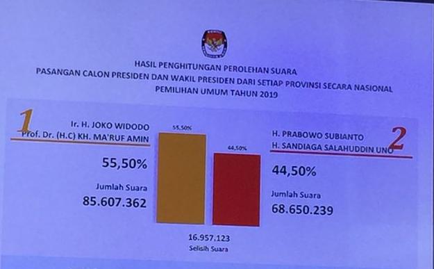 Berdasarkan hasil Rekapitulasi Nasional itu, KPU RI menetapkan pasangan presiden dan wakil presiden Joko Widodo – Ma’ruf Amin sebagai pemenang Pilpres 2019. Pasangan nomor urut 1 itu memperoleh suara 85.607.362 atau 55,50 %. Sementara pasangan nomor urut 2 Prabowo Subianto – Sandiaga Salahudin Uno memperoleh suara 68.650.239 atau 44,50 %.